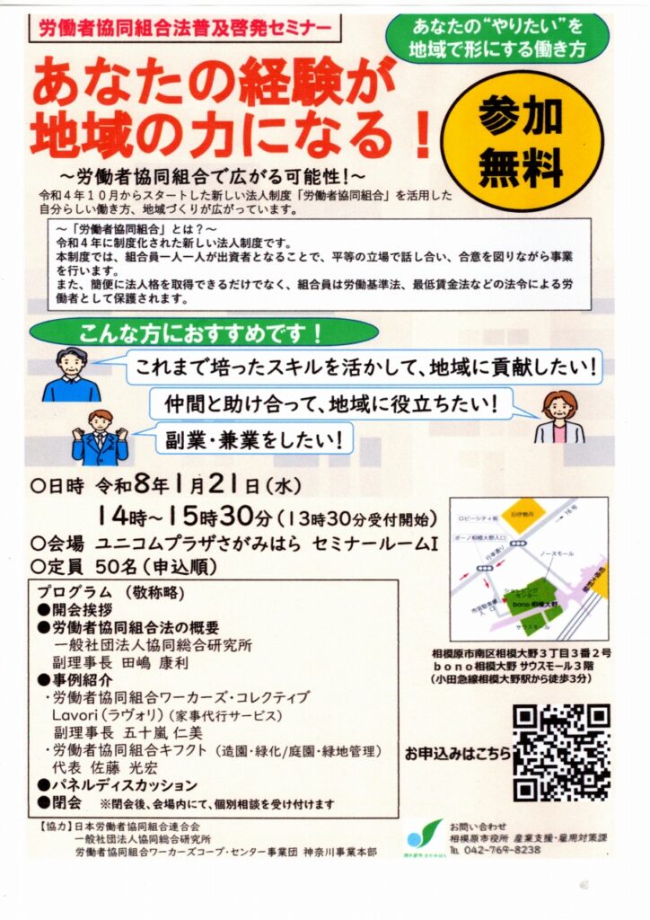 相模原市産業支援・雇用対策課からのお知らせ 投稿日時: 2025年12月16日 投稿者: ayu 労働者協同組合法普及啓発セミナー「あなたの経験が地域の力になる~労働者協同組合法で広がる可能性~」を開催します詳細は、下記をご覧ください。 FacebookXBluesky シェア
